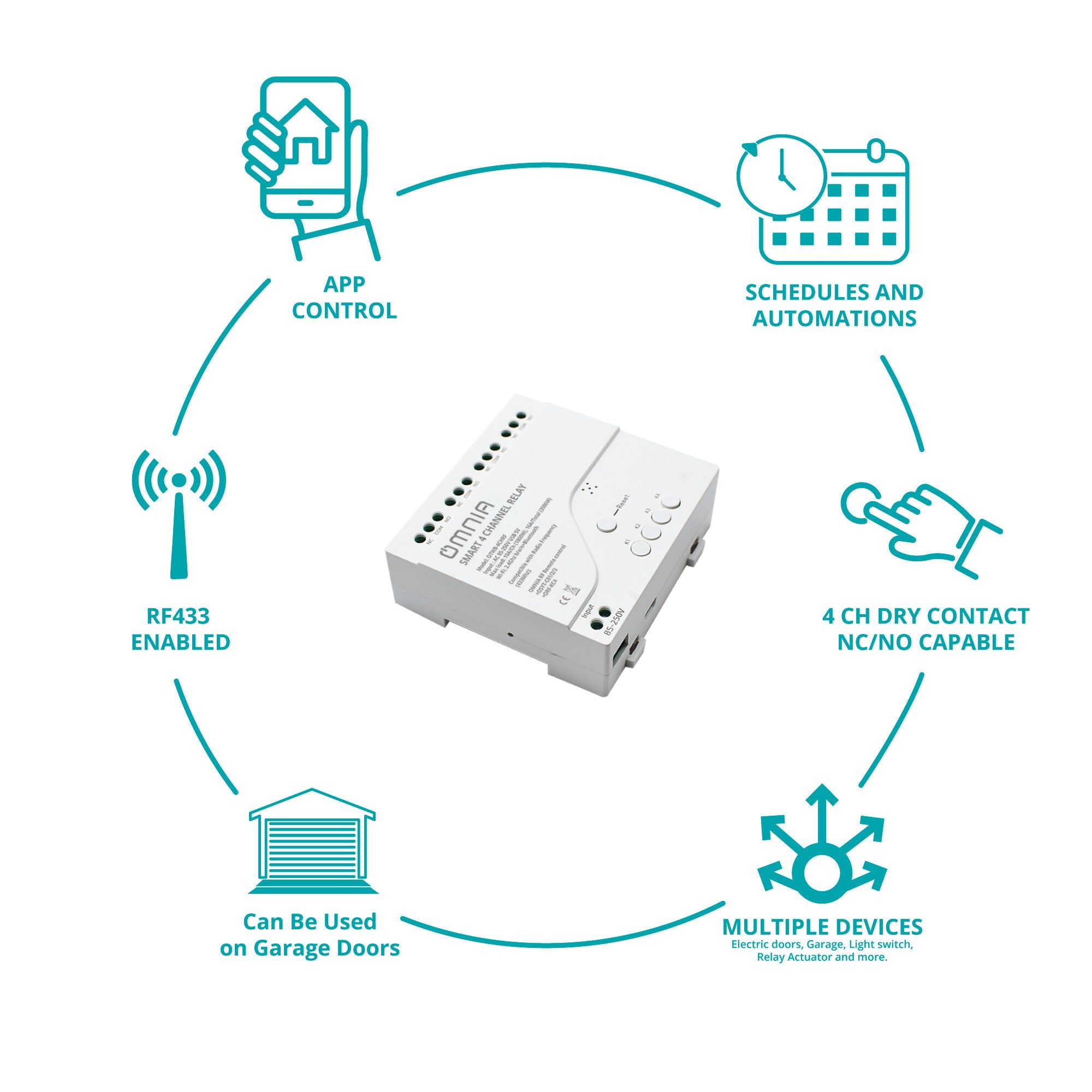 El Smart 4 channel relay OMNIA ayuda a automatizar portones eléctricos y cotinas metalicas para poder controlarlas desde el app o nuestro Control remoto de llavero y de pared RF OMNIA.