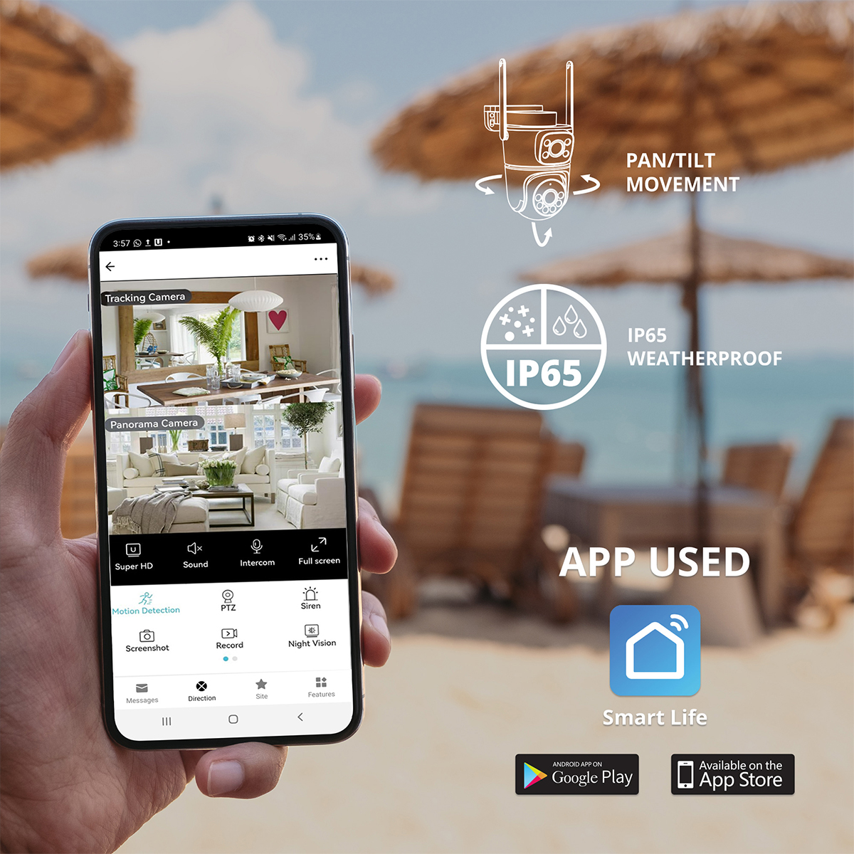 Cuenta con una sirena que se puede activar por movimiento en horarios específicos o de manera manual en la aplicación.