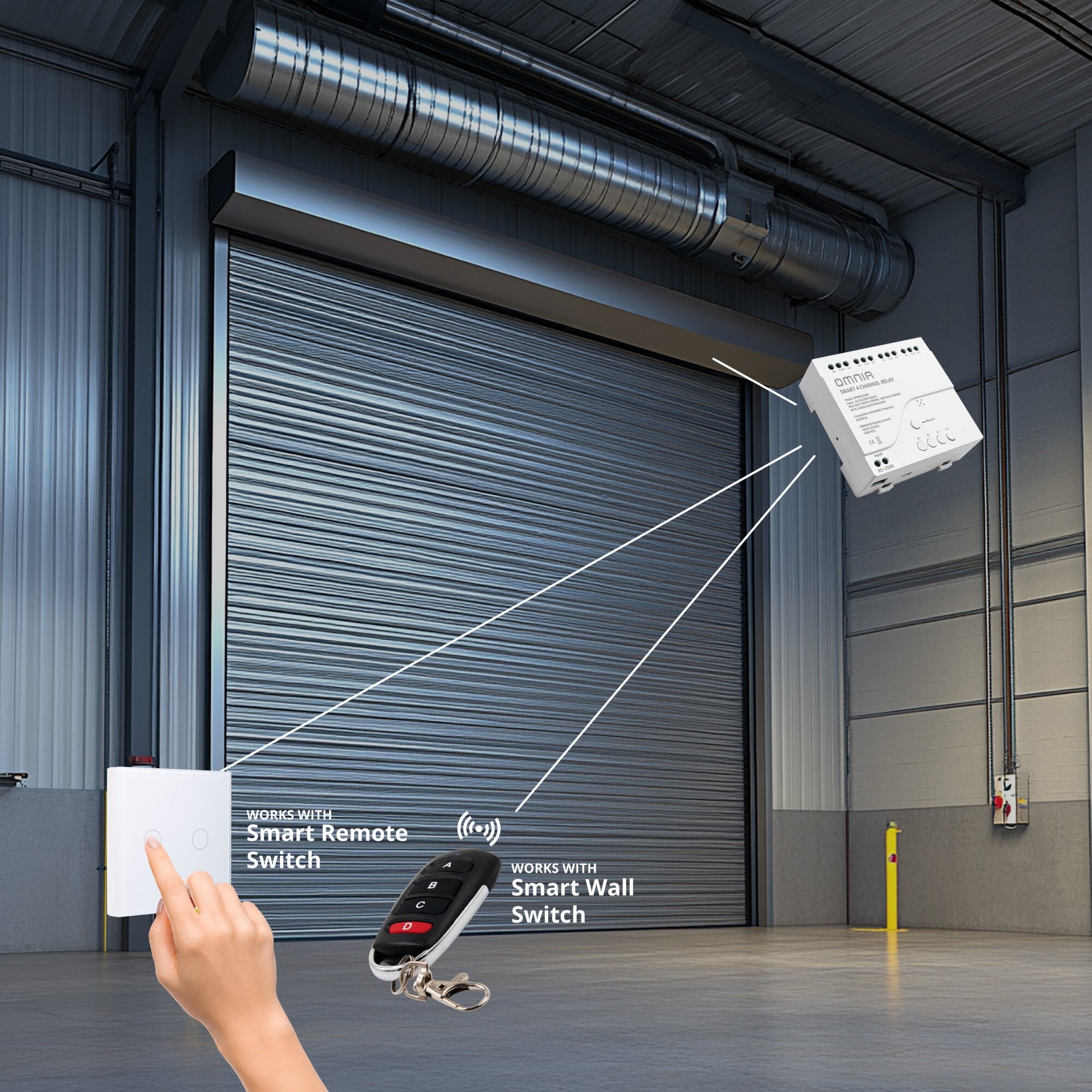 El Smart 4 channel relay OMNIA ayuda a automatizar portones eléctricos y cotinas metalicas para poder controlarlas desde el app o nuestro Control remoto de llavero y de pared RF OMNIA.